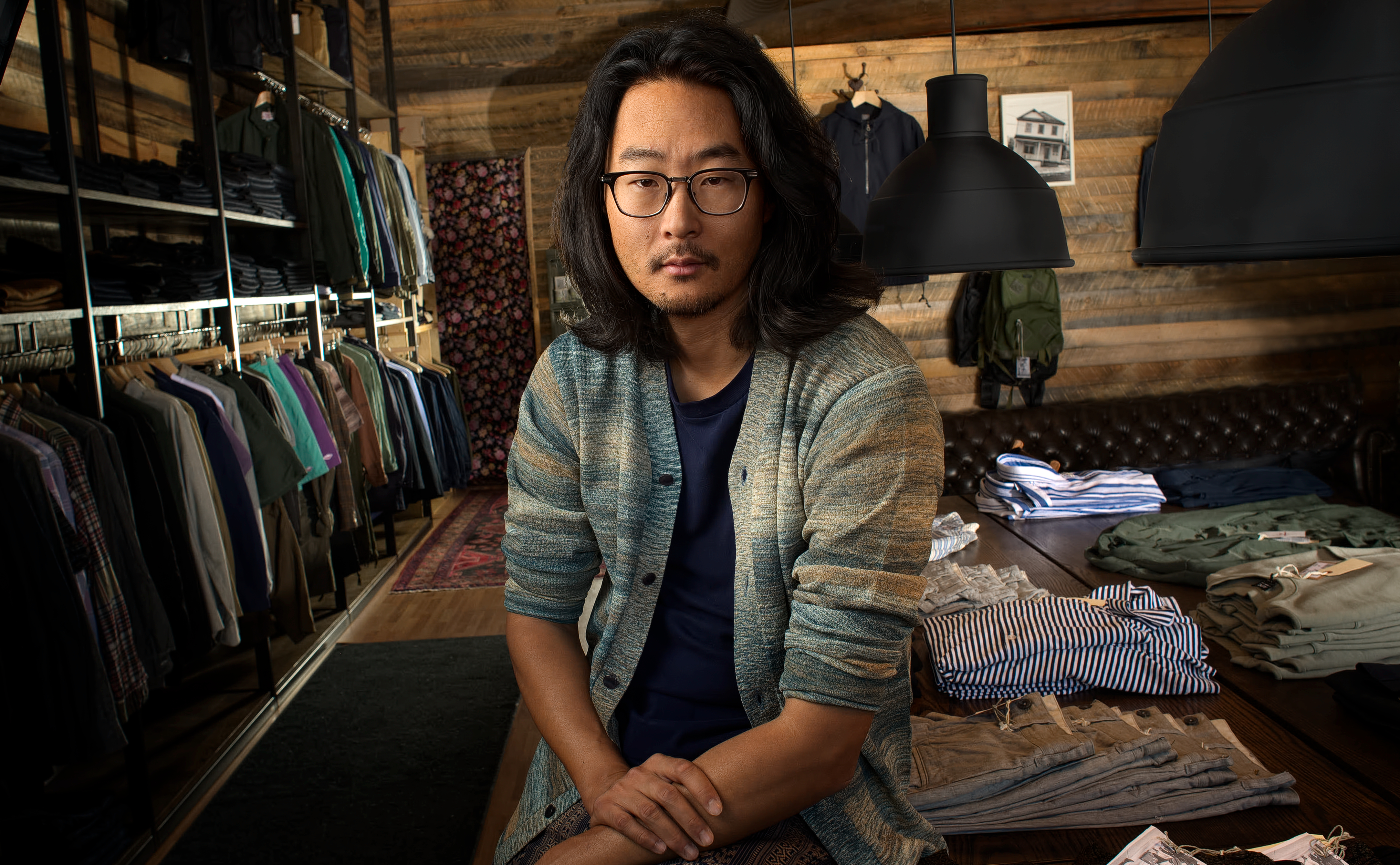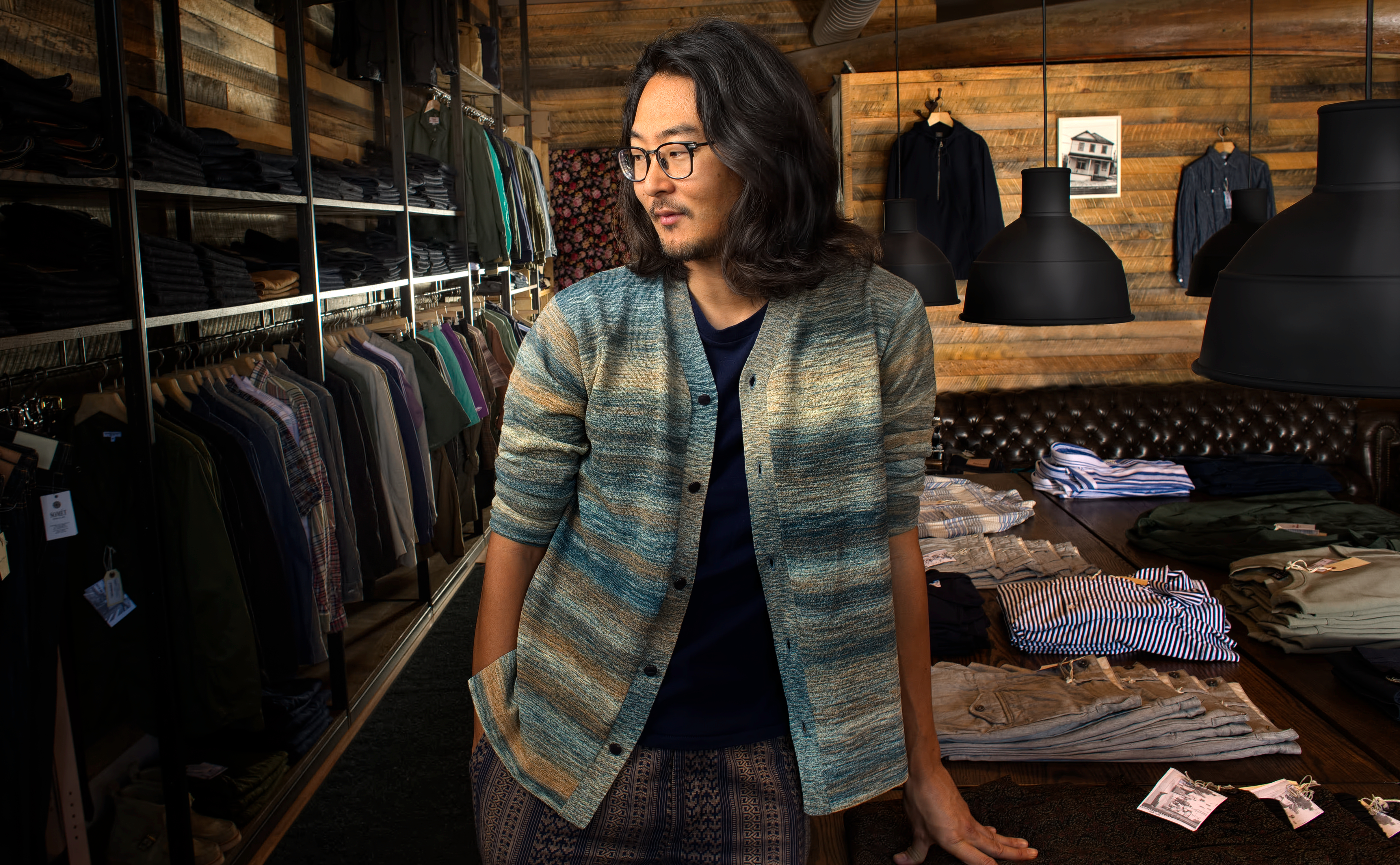 I had met Steve Kang, the owner, a couple of times. Clearly this store was his creation, from the ground up. Classic mission, massive old tables display the clothes. A wooded old-style canoe hangs over a classic leather couch.