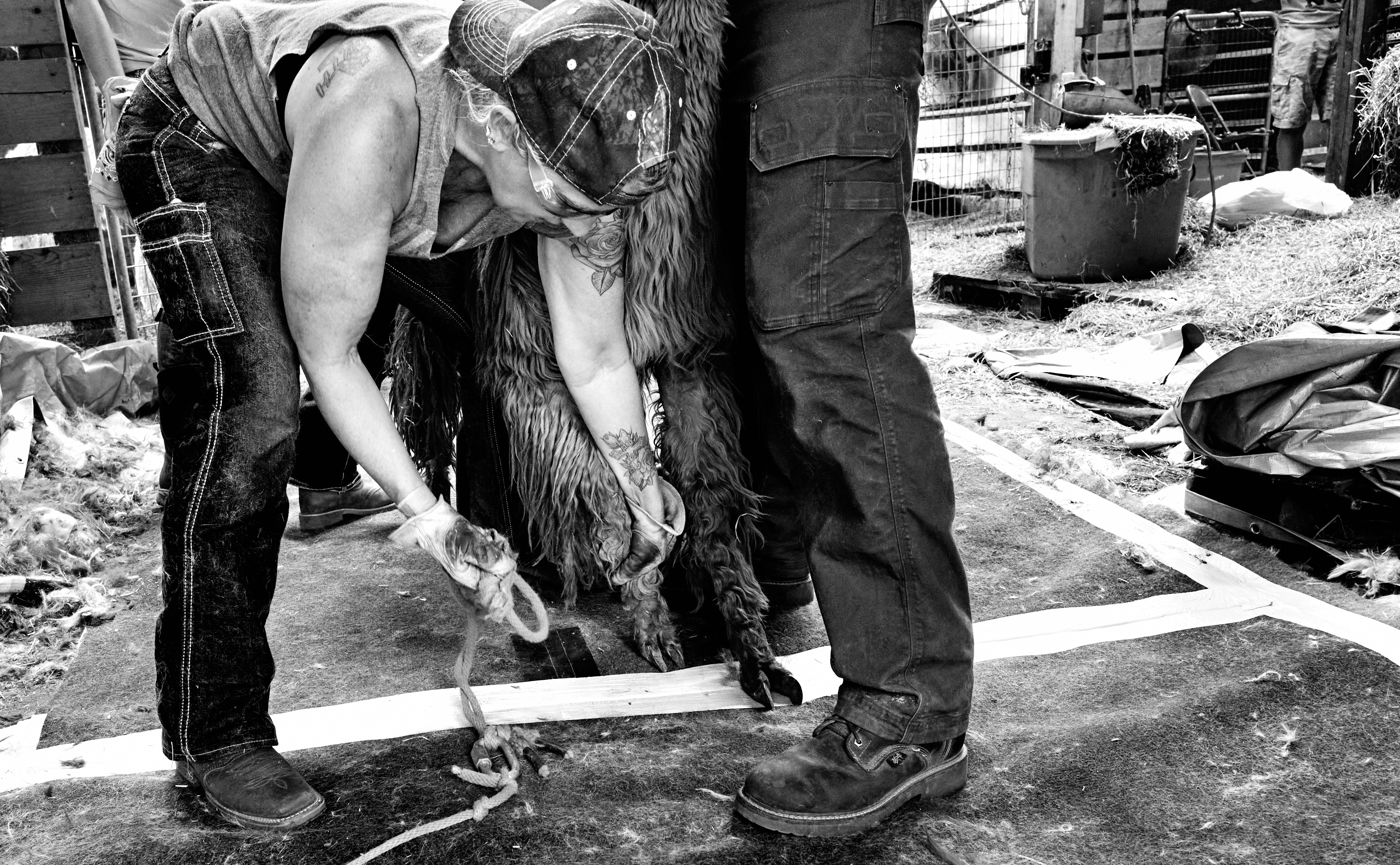 For this shoot, I was simply documenting the shearing of the animals. Something they have to do about every 12 months in the late spring. For this, they hire Bernie from South Dakota. She is an expert who started shearing many years ago. And she travels around the country doing this. Talk about an unusual job! But don’t look to hire her—no new clients, as she is “retired”.