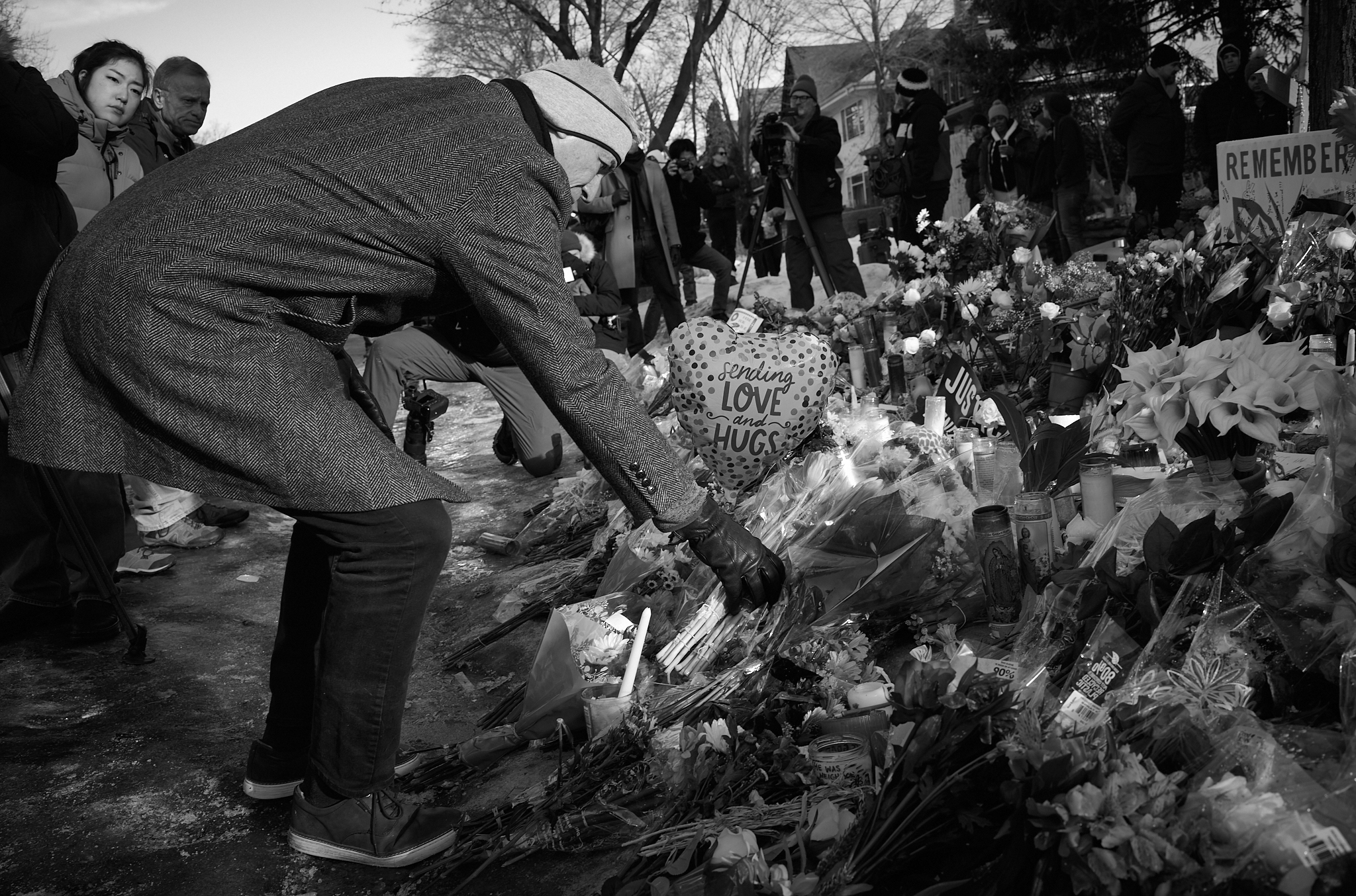 Candles had been set out overnight. Flowers, flags, and handwritten notes formed a loose, improvised memorial. It felt familiar in an unsettling way—another collection of objects meant to hold grief when there are no words for it. People moved carefully around it, pausing, reading, adding what they could. The mood wasn’t confrontational. It was reflective. Heavy with questions about how the city keeps returning to moments like this, and why.